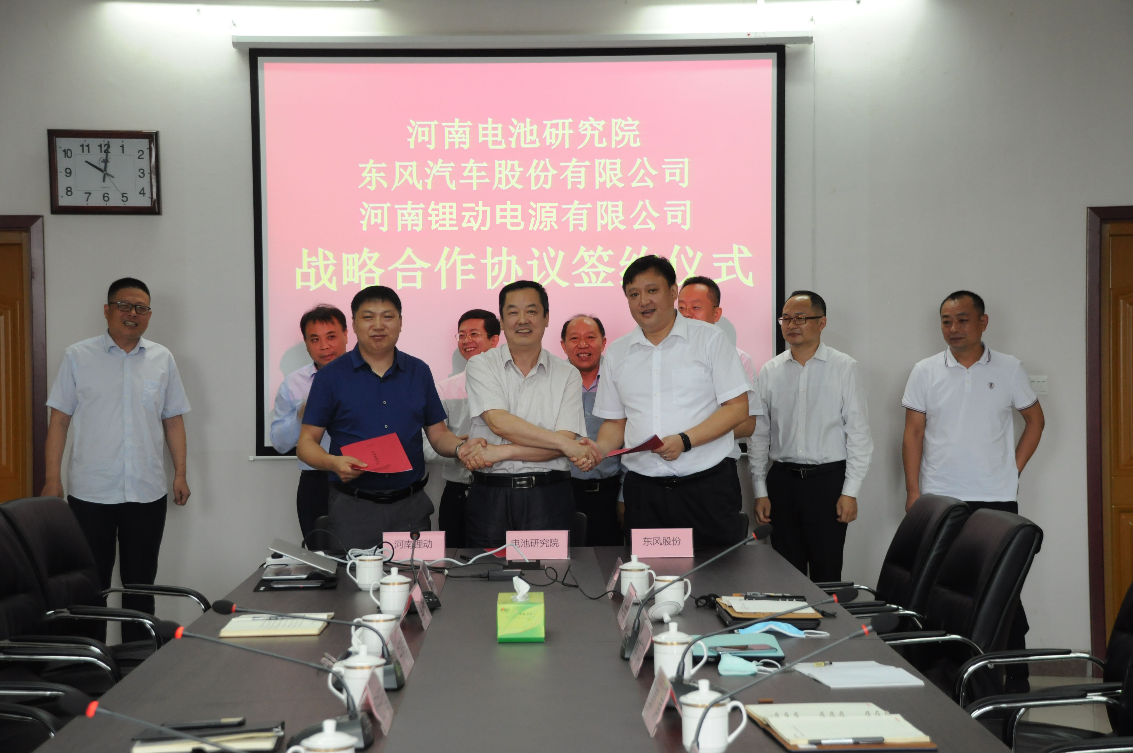 6月17日,在河师大国家与地方联合实验室,东风汽车股份有限公司、河师大国家与地方联合实验室与河南锂动电源有限公司三方进行座谈交流并签署战略合作协议。东风汽车股份有限公司党委书记郭涛,新能源事业部总经理程裕涛,事业计划部副部长黄志本,市政协副主席、河师大国家与地方联合实验室院长杨书廷,牧野区委书记牛晓辉,河师大国家与地方联合实验常务副院长张德预、牧野区政府副区长李向军、河南锂动电源有限公司董事长冀学峰,总经理杨涛等人参与了此次战略合作协议的签订。